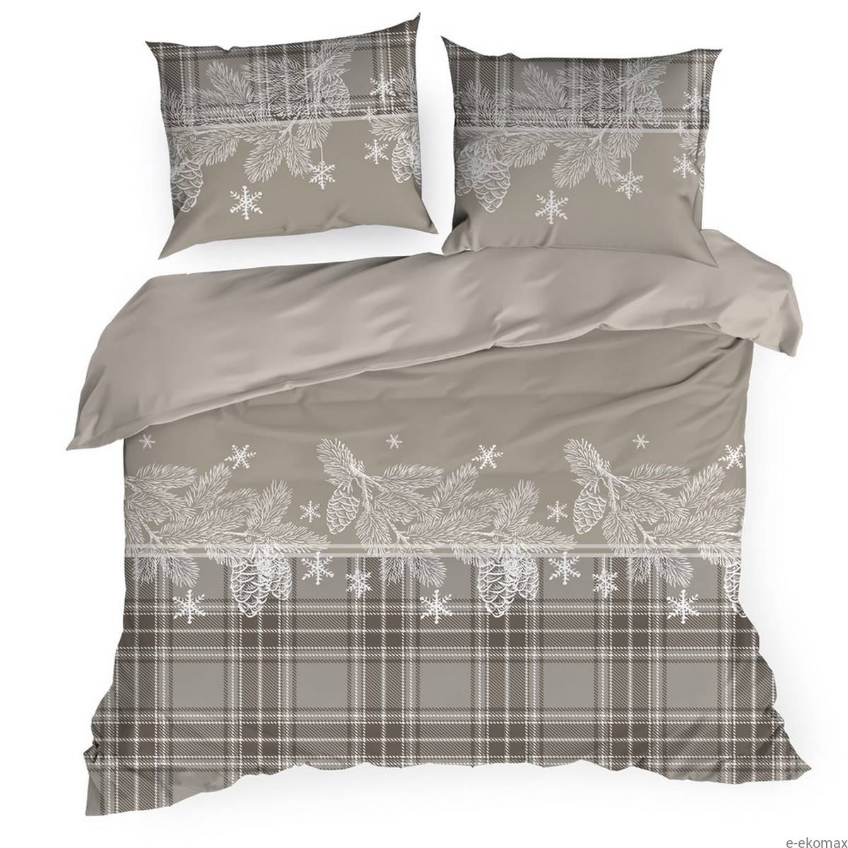 Komplet pościeli z bawełny satynowej ze świątecznym motywem śnieżynek oraz gałązek z szyszkami  .Pościel miekka ,przyjemna w dotyku   o jedwabistym połysku.